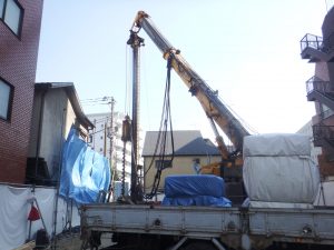 写真のように長いリーダー(縦軸)のついた重機で地面を長いドリルで掘削してH型鋼を挿入して親杭とします。
