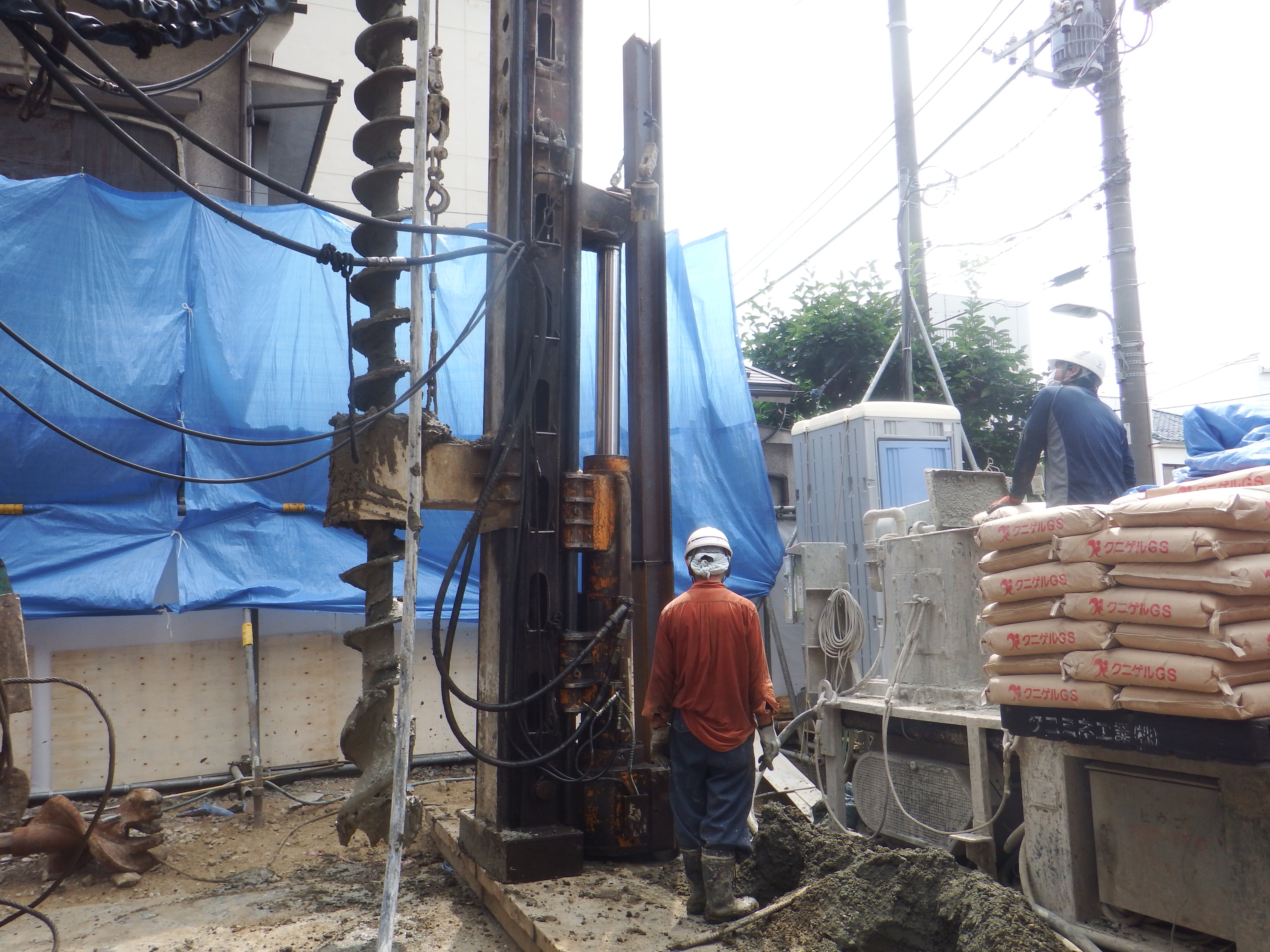 地面にあけた穴にH型鋼を挿すだけではぐらつくので、ドリルでの掘削の際セメントミルクを地中に噴射しながら穴の中の土砂をかきまぜてドリルを抜くと泥状の穴が出来あがります。そこへH型鋼を挿入すると、しっかりした親杭が出来上がります。